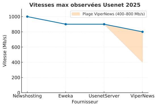 - Les fournisseurs Usenet que nous conseillons offrent des débits maxi de 10 Gb/s !!! Aucun autre service de partage de fichiers, de Streamings ou Hébergeurs de fichiers peut offrir un tel débit.